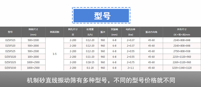 機(jī)制砂直線振動篩的型號有:DZSF-515、DZSF-520、DZSF-1020、DZSF-1025、DZSF-1030、DZSF-1035、DZSF-1540等型號,型號越大價(jià)格就會越貴,每個型號的直線振動篩都能安裝1-5層的篩網(wǎng),單層可以進(jìn)行簡單的篩分、過濾工作,多層可以滿足除雜、分級等不同規(guī)格物料的篩分。不同型號滿足不同用戶對于機(jī)制砂篩分的需求。