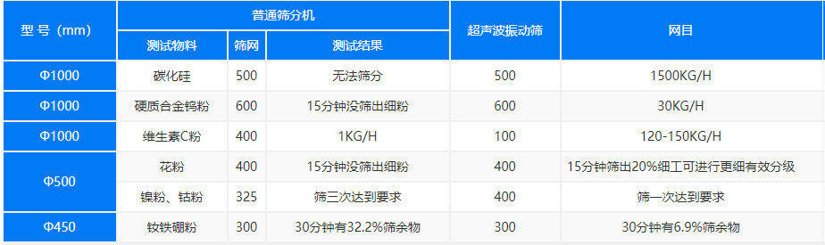 超聲波振動(dòng)篩的常規(guī)型號(hào)有直徑600mm、直徑800mm、直徑1000mm、直徑1200mm、直徑1500mm等。不同種直徑的旋振篩篩分的物料量、目數(shù)也不同。舉個(gè)例子,直徑600型超聲波振動(dòng)篩測(cè)試物料花粉,篩網(wǎng)目數(shù)400目,15分鐘篩出20%的細(xì)粉,并可以進(jìn)行更細(xì)有效分級(jí)。
