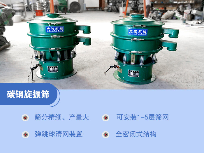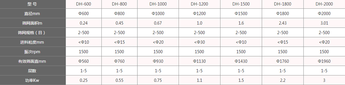 碳鋼旋振篩型號有:DH-400mm、DH-600mm、DH-800mm、DH-1000mm、DH-1200mm、DH-1500mm、DH-1800mm、DH-2000mm等八種標(biāo)準(zhǔn)型號。