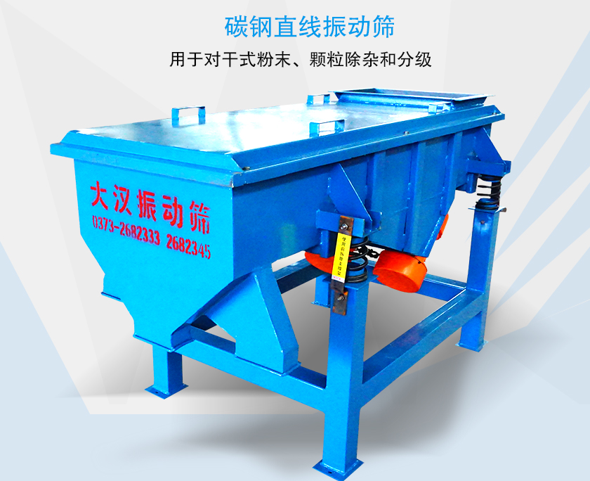 碳鋼直線振動篩適用于粒度在0.074~10mm,含水量小于7%的無粘性干式粉末、顆粒,主要用于磨料、化工、塑料、陶瓷、冶金、建材、糧食及化肥行業。